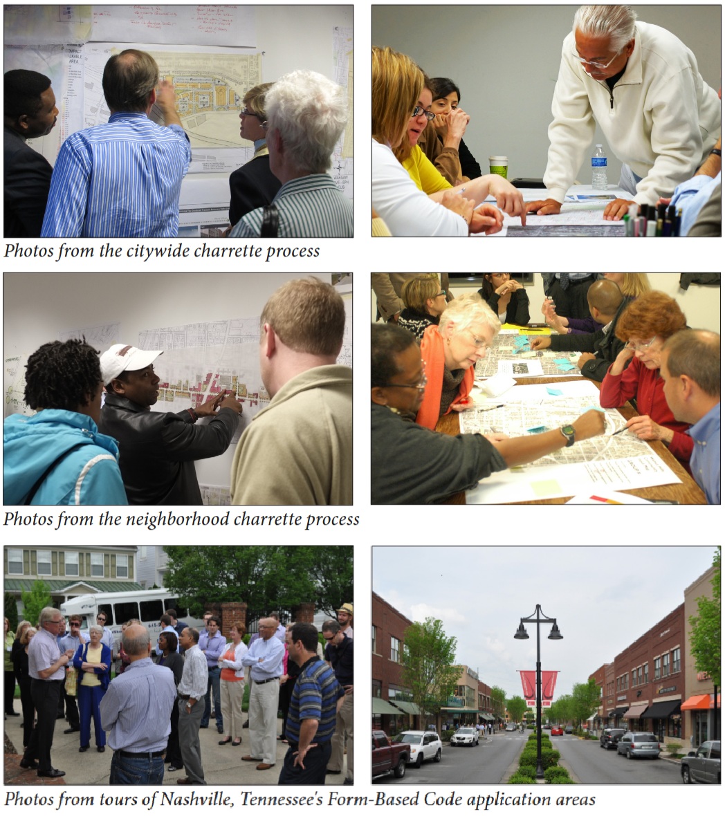 From October 29 to November 1, 2012, the four pilot neighborhoods went through a detailed visioning process with the consulting team and City staff called the “Neighborhood Charrette.” Hundreds of neighborhood residents and stakeholders attended and gave input. Detailed graphics were created for each vision and how it could be made possible using FBC.