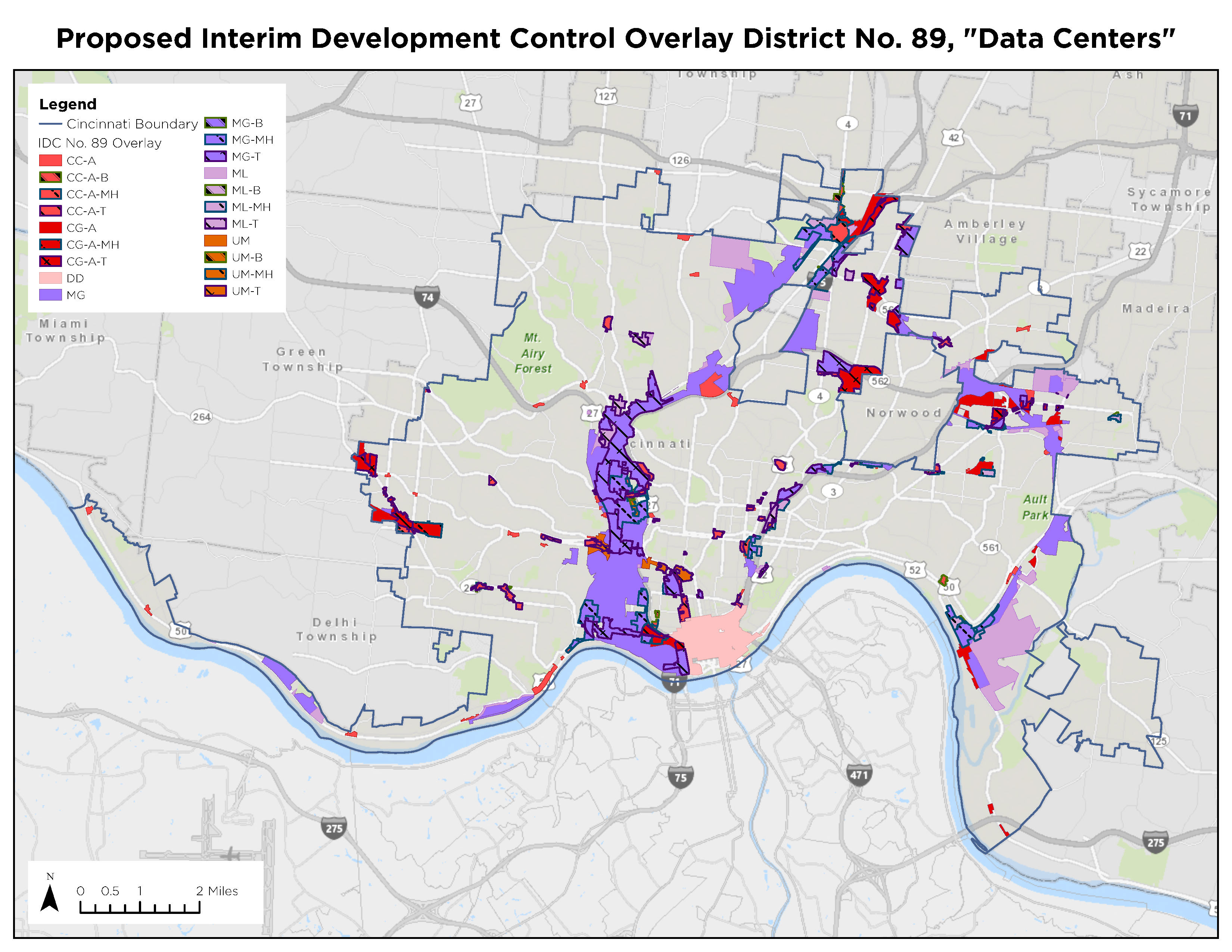 The proposed subject area for the IDC Overlay District includes properties within the City of Cincinnati in zoning districts that currently allow indoor storage, because that is how data center applications are currently classified. The following zoning districts comprise the proposed IDC Overlay District, encompassing over 22,000 individual parcels: