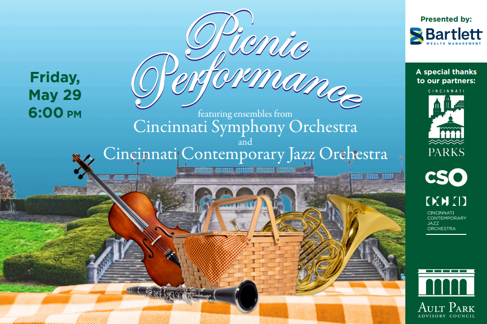 The Ault Park Picnic Performance Featuring ensembles from Cincinnati Symphony Orchestra and Cincinnati Contemporary Jazz Orchestra.