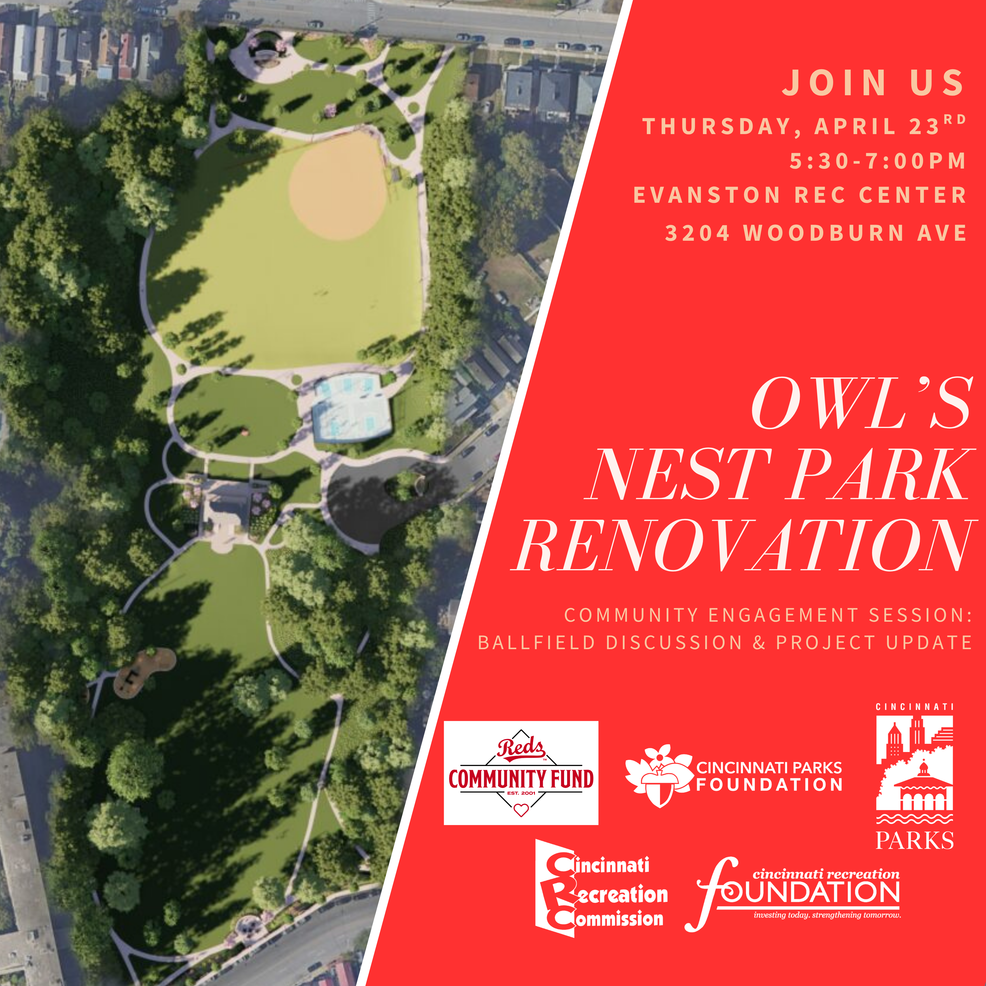 Please join Cincinnati Parks, Cincinnati Parks Foundation, Reds Community Fund, Cincinnati Recreation Commission, and Cincinnati Recreation Foundation on April 23rd for an update on the renovation of Owl's Nest Park, as well as a discussion on the ballfield portion of the project. This community engagement session is open to all!