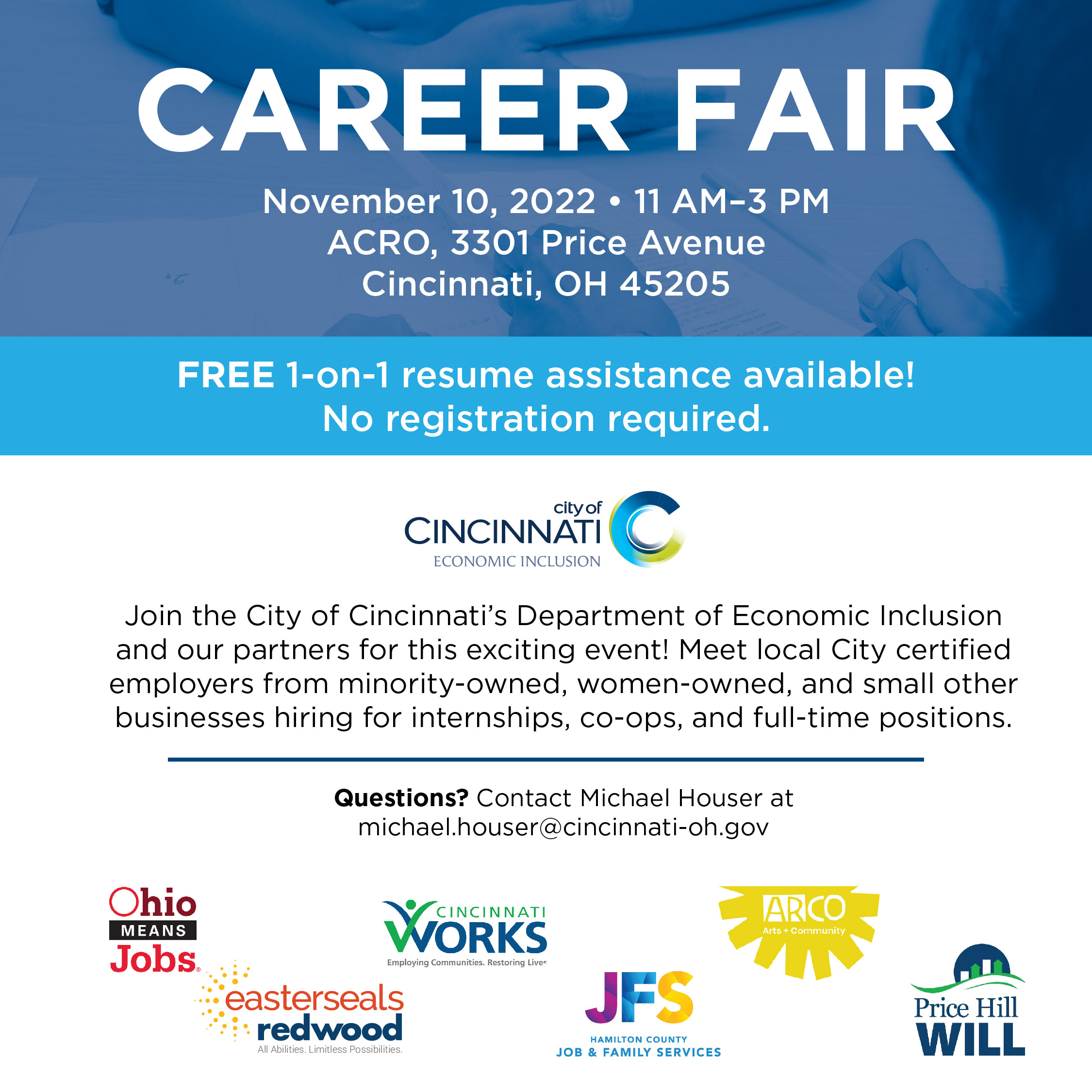 Join the City of Cincinnati’s Department of Economic Inclusion and its partners for another CAREER FAIR! Meet local city-certified employers from minority-owned, women-owned, and other small businesses hiring for internships, co-ops, and full-time positions. Join us for free 1-on-1 resume assistance from Easter Seals Redwood and Hamilton County Probation Office will be on hand for on-site criminal records expungement. No registration is required.