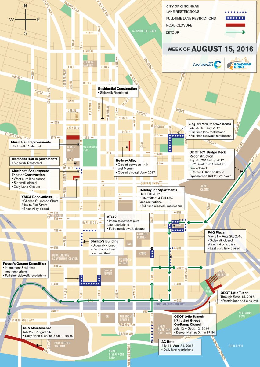 Here's a list of road closures and lane restrictions in Downtown Cincinnati, Over-the-Rhine and The Banks during the week of Aug. 15. There's also a map at the bottom of the page that pinpoints specific areas.