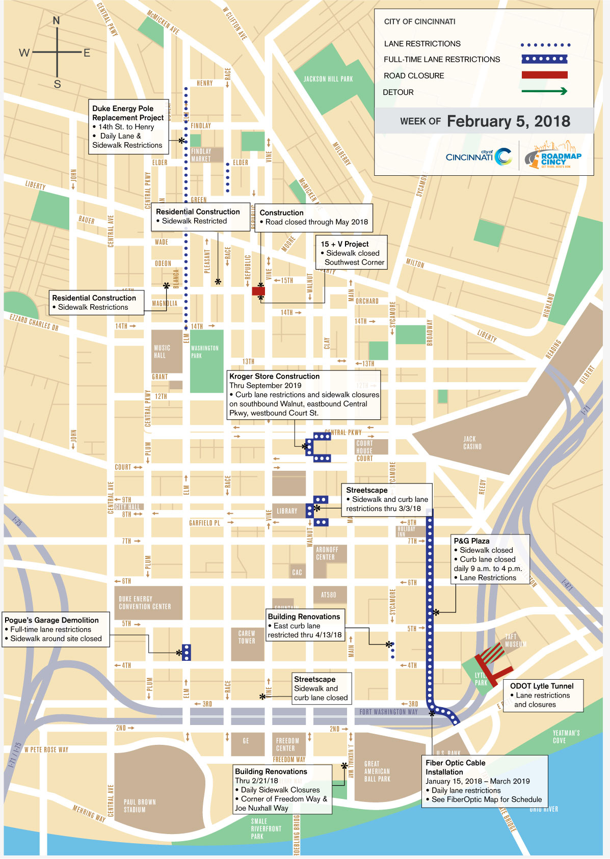 The following lists road closures and lane restrictions in Downtown Cincinnati, Over-the-Rhine and The Banks during the week of Feb. 5, 2018.