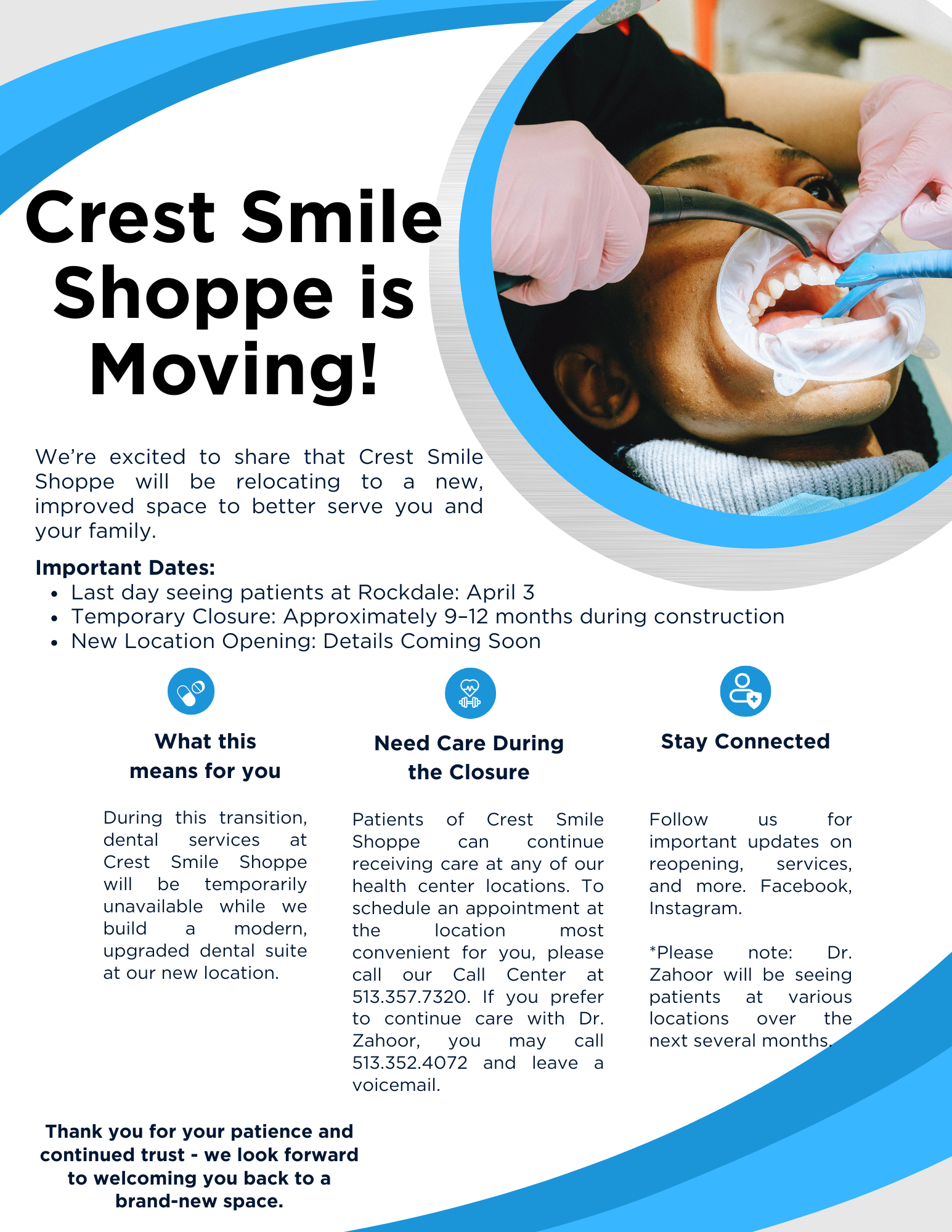 We are thrilled to announce that Crest Smile Shoppe is relocating to a new, improved space! This transition will allow us to build a modern, upgraded dental suite designed to better serve our community.
