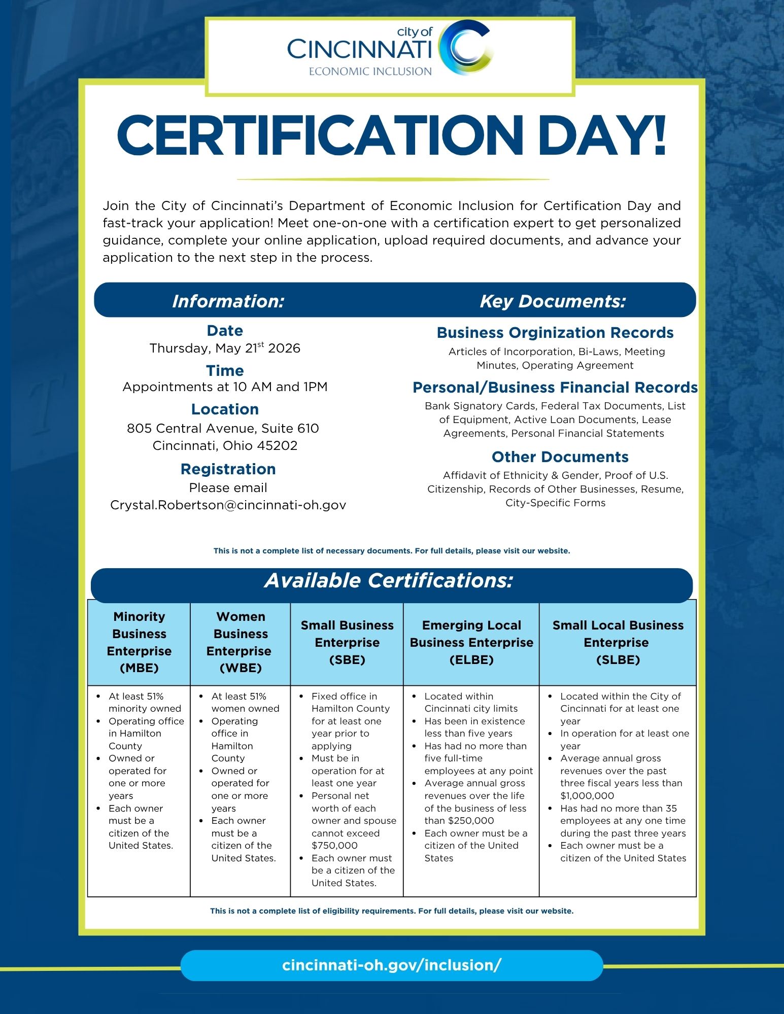 The Department of Economic Inclusion’s goal is to ensure economic opportunity and inclusion for all citizens seeking to do business with the City of Cincinnati and serve as a catalyst for the growth of minority- and women-owned businesses in the City and throughout the region.