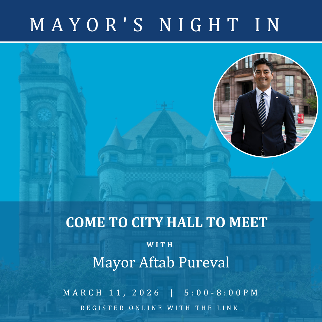Mayor Aftab wants to hear from you! The next Mayor's Night In is March 11th from 5:00 - 8:00pm. Residents will join the Mayor to discuss the issues, priorities, or ideas that matter most to them.