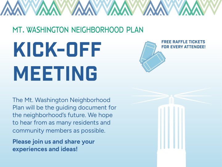 Please join us at Mt. Washington School on for the Kick-off Meeting for the neighborhood planning process! This is the first of many opportunities that community members will have to contribute your thoughts and ideas to help shape the vision of Mt. Washington's future.