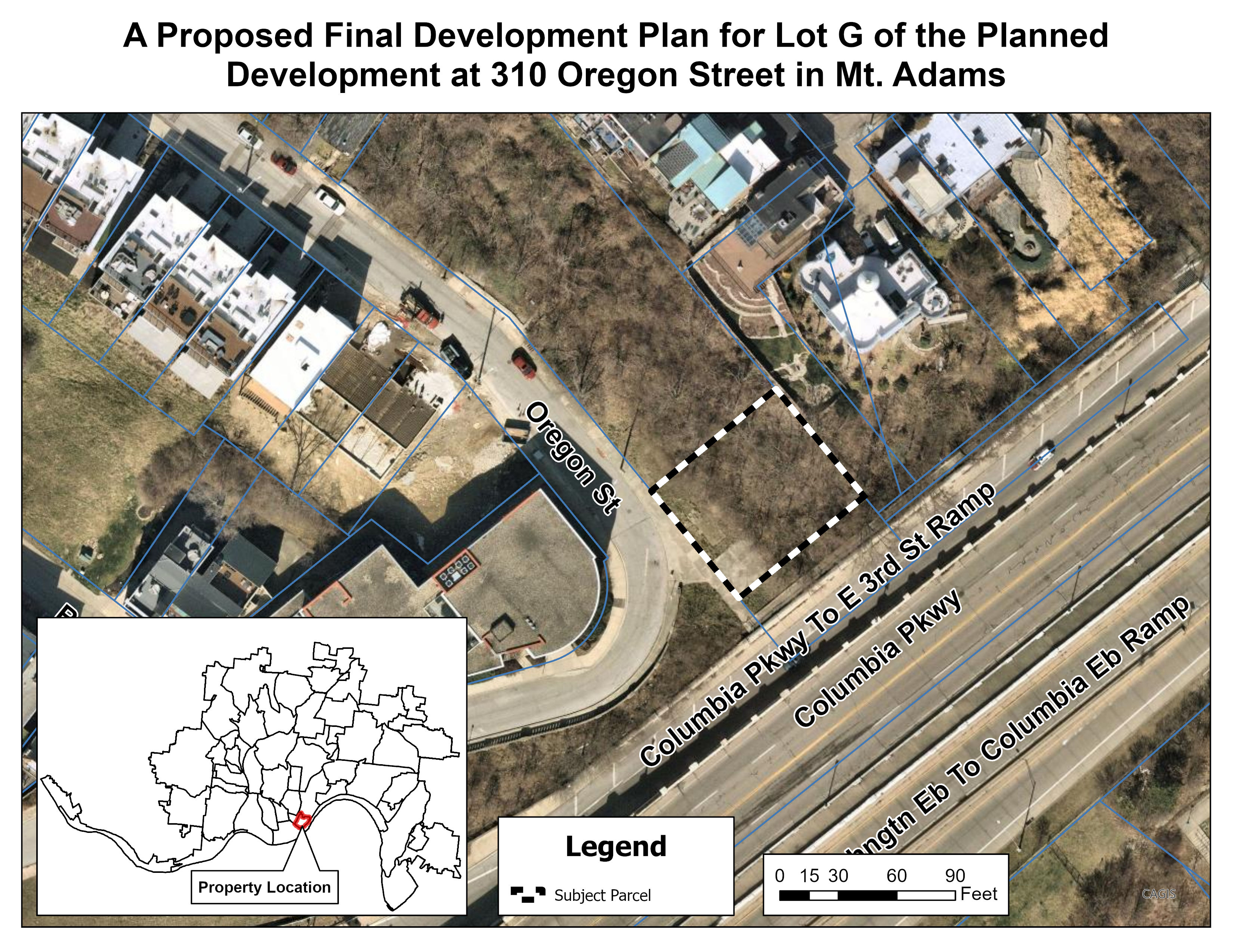 The applicant, Tilsley and Associates, is requesting a Final Development Plan (FDP) for Lot G of the Oregon Street and Baum Street Planned Development (PD) at 310 Oregon Street in Mt. Adams. The subject property is currently vacant, and the applicant is proposing to build a three-unit condominium building with parking located in a first-floor garage. The Oregon Street and Baum Street PD has legacy “Planned Unit Development” (PUD) zoning rights that were determined by the City before the Zoning Code was updated in 2004.