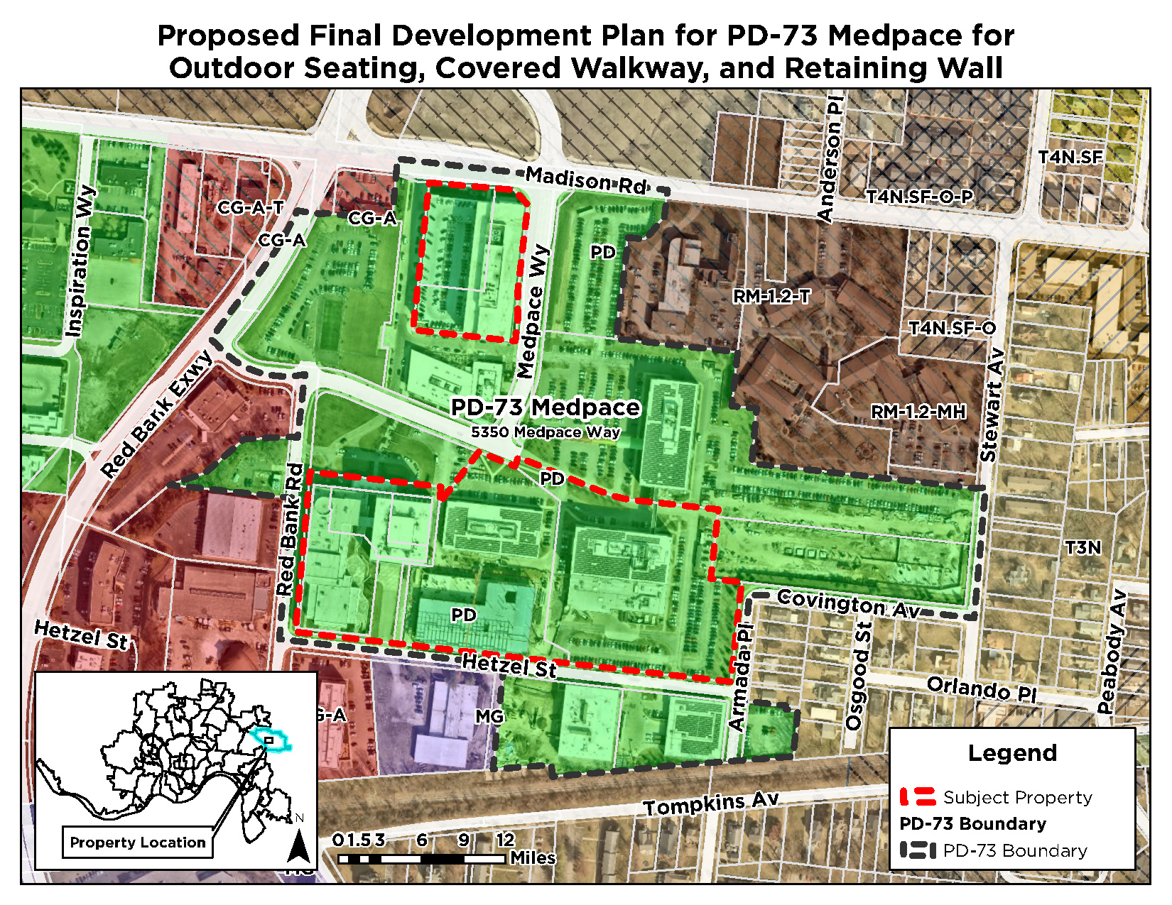 In 2015, the City Planning Commission recommended approval of a change in zoning to City Council to create Planned Development #73 (PD-73, Medpace). City Council approved the zone change, Concept Plan, and Development Program Statement as Ordinance 320-2015 on October 7, 2015. An additional 3.002 acres were added to the Planned Development by way of a Major Amendment to the Concept Plan and Development Program Statement in 2017 (Ordinance 000-2017).