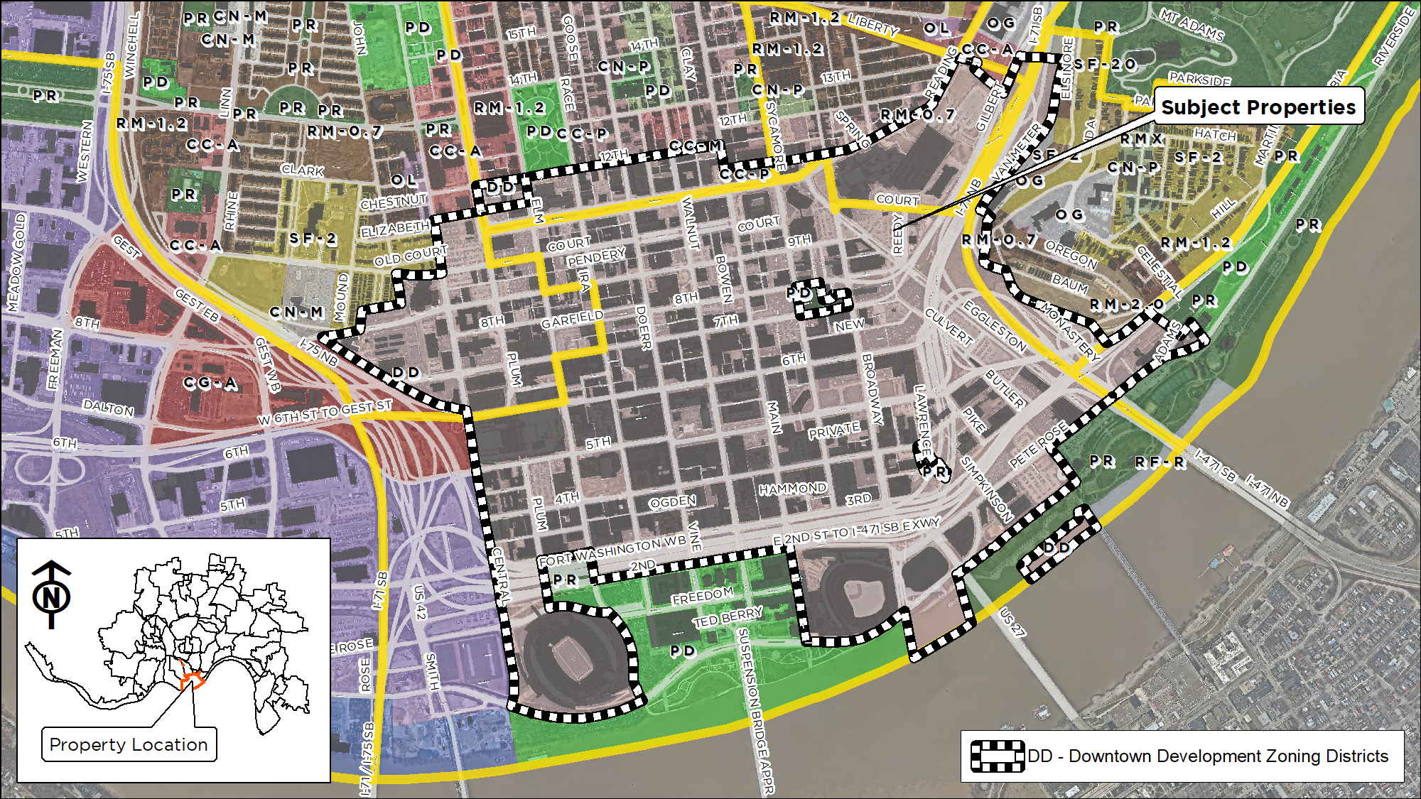 The study area for the zoning study includes all properties zoned Downtown Development (DD). This area encompassing most of Downtown and parts of East End, Mount Adams, Mount Auburn, Pendleton, Over-the-Rhine, and West End neighborhoods. (see map below).