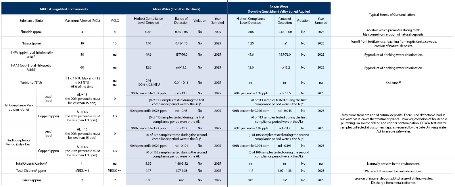 GCWW is proud to say that our water meets or exceeds all health standards established by both the USEPA and the Ohio EPA. To ensure that tap water is safe to drink, the USEPA issues regulations that limit the levels of certain contaminants in water provided by public water systems. Food and Drug Administration (FDA) regulations establish limits on contaminants in bottled water, which shall provide the same level of public health protection. The tables below show the substances detected in GCWW drinking water while performing the most up-to-date monitoring required by the EPA. The Ohio EPA requires GCWW to monitor for certain contaminants less than once per year because their concentrations do not change frequently. Because of this, some of our data, though accurate, is more than one year old. For a complete listing of GCWW test results and additional water quality information, visit WQT.myGCWW.org, or call 513.591.7700.